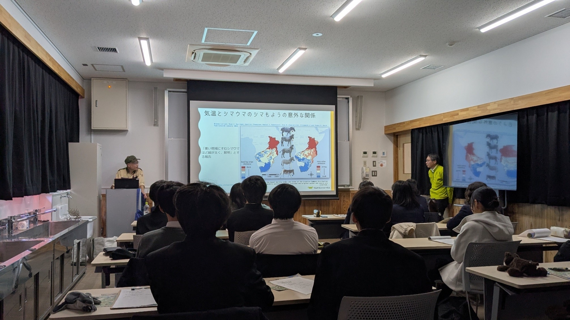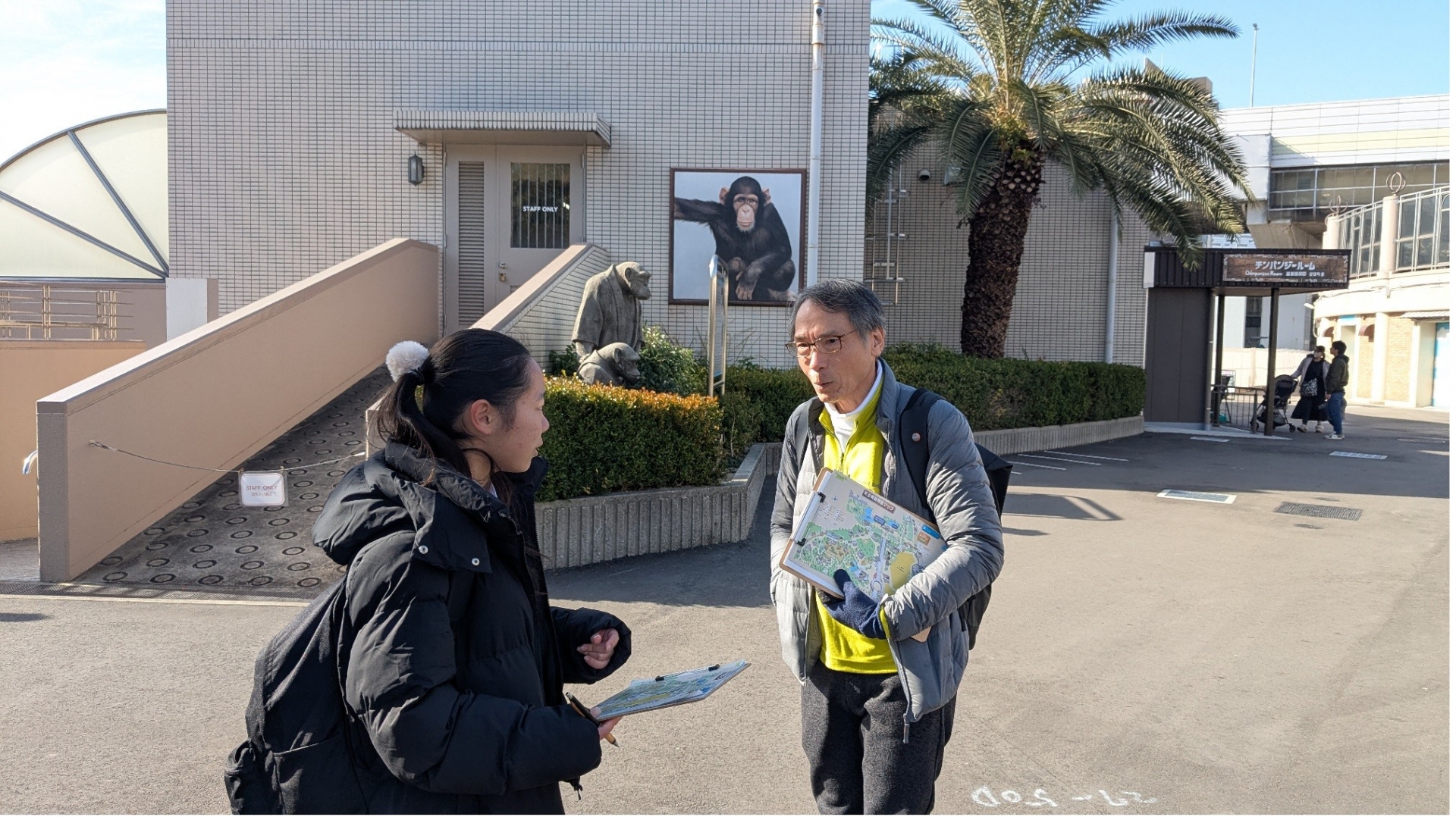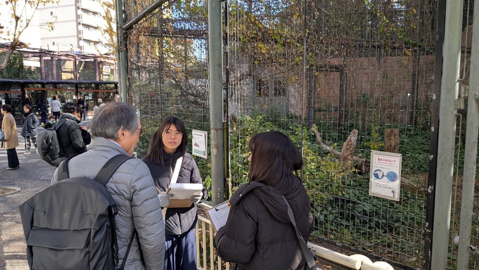 講師をお願いした大阪公立大学大学院獣医学研究科 教授 三宅 眞実 先生には、園内を大手前生とともに散策していただきました。研修室では不思議に思ったことや発見したことをディスカッションしましたが、ここでは獣医師でもある副園長 安福 潔 先生にも協力いただき、動物園の運営や展示の仕組み、動物の衛生管理まで幅広い質問に答えていただきました。